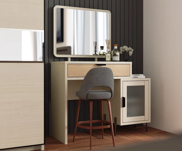 Tampilan serasi dengan warna lembut bernuansa musim semi. Rasakan kehangatannya dimulai dari Lemari Pakaian 3 Pintu, Meja Nakas, dan Meja Rias di ruangan hunian Anda.