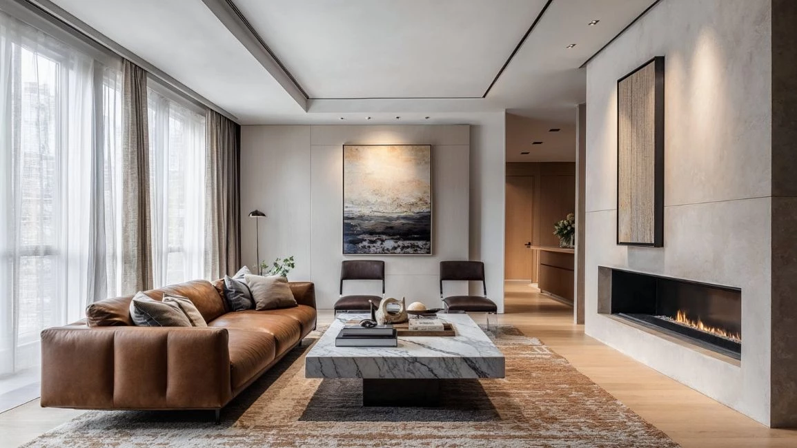 3. Nuansa Hangat Netral + Kayu & Marmer